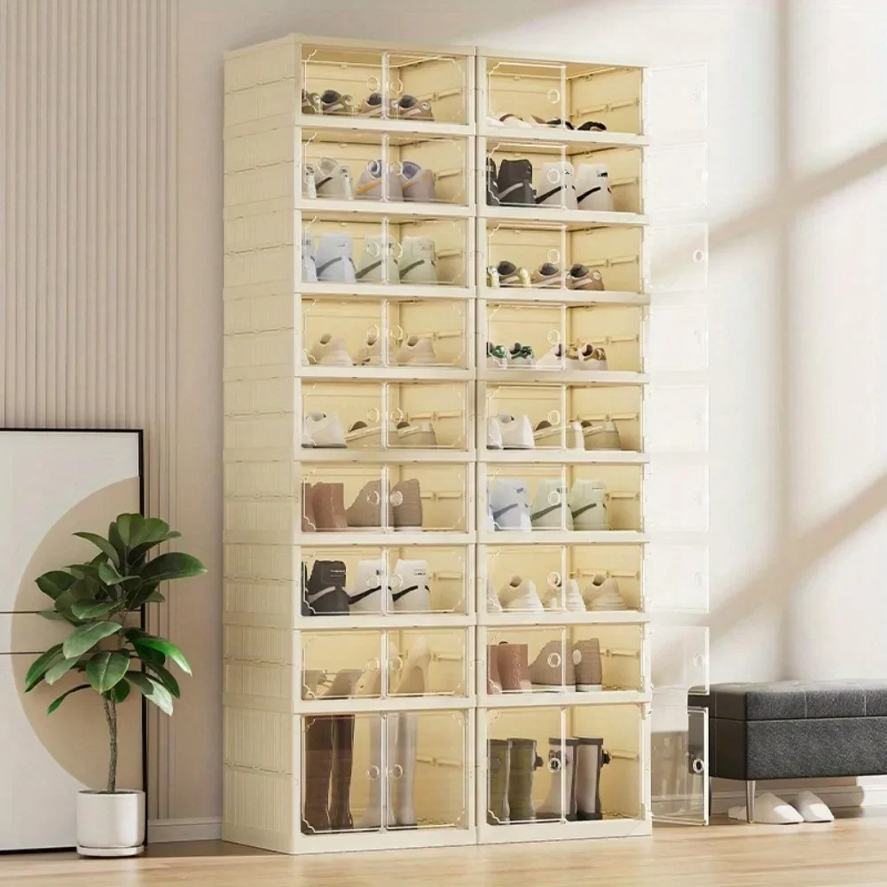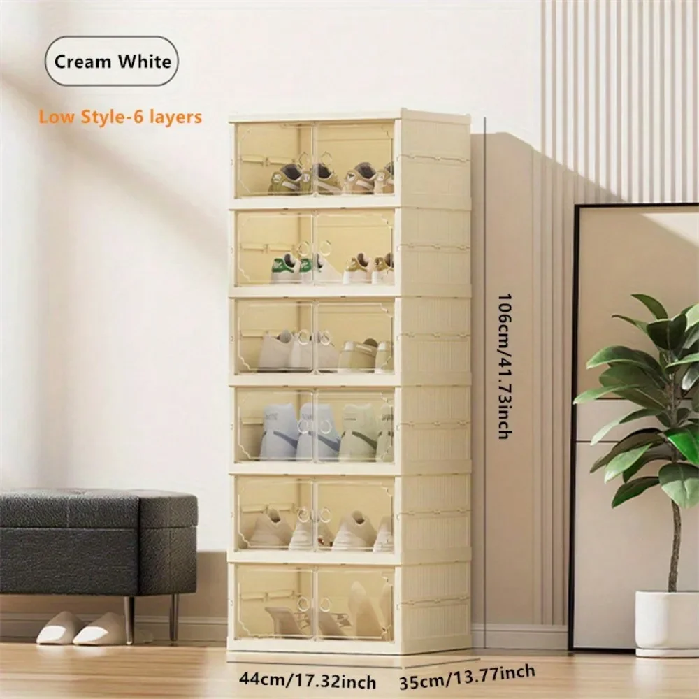 -3-Minute Quick Installation Design: The Shoe Organizer Storage Box is designed for quick and easy installation. With its one-piece folding design, you can set it up in just 3 minutes, saving you time and effort. It's also easy to fold back for storage or carrying, making it convenient for use in different locations. -Dustproof magnetic door shoe rack: The transparent door panel allows for easy shoe retrieval while keeping them protected from dust and water. The magnetic doors ensure effortless access to your shoes, making organization a breeze. Upgrade your shoe storage with this stylish and practical solution. -Multifunctional Storage Box:This collapsible shoe rack is not just limited to shoe storage. It is designed to cater to all kinds of storage needs. It can accommodate standard-sized men's and women's shoes, including sneakers, flat shoes, high heels, and more. Additionally, it can be used to store and organize daily items such as books, toys, cosmetics, snacks, towels, and collections. -Suitable for Various Scenarios:The Shoe Organizer Storage Box is suitable for a variety of scenarios. Whether you need extra shoe storage in your wardrobe, bedroom, living room, garage, loft, or even outdoor spaces, this foldable shoe case has got you covered. Its versatile design and functionality make it a great addition to any household.